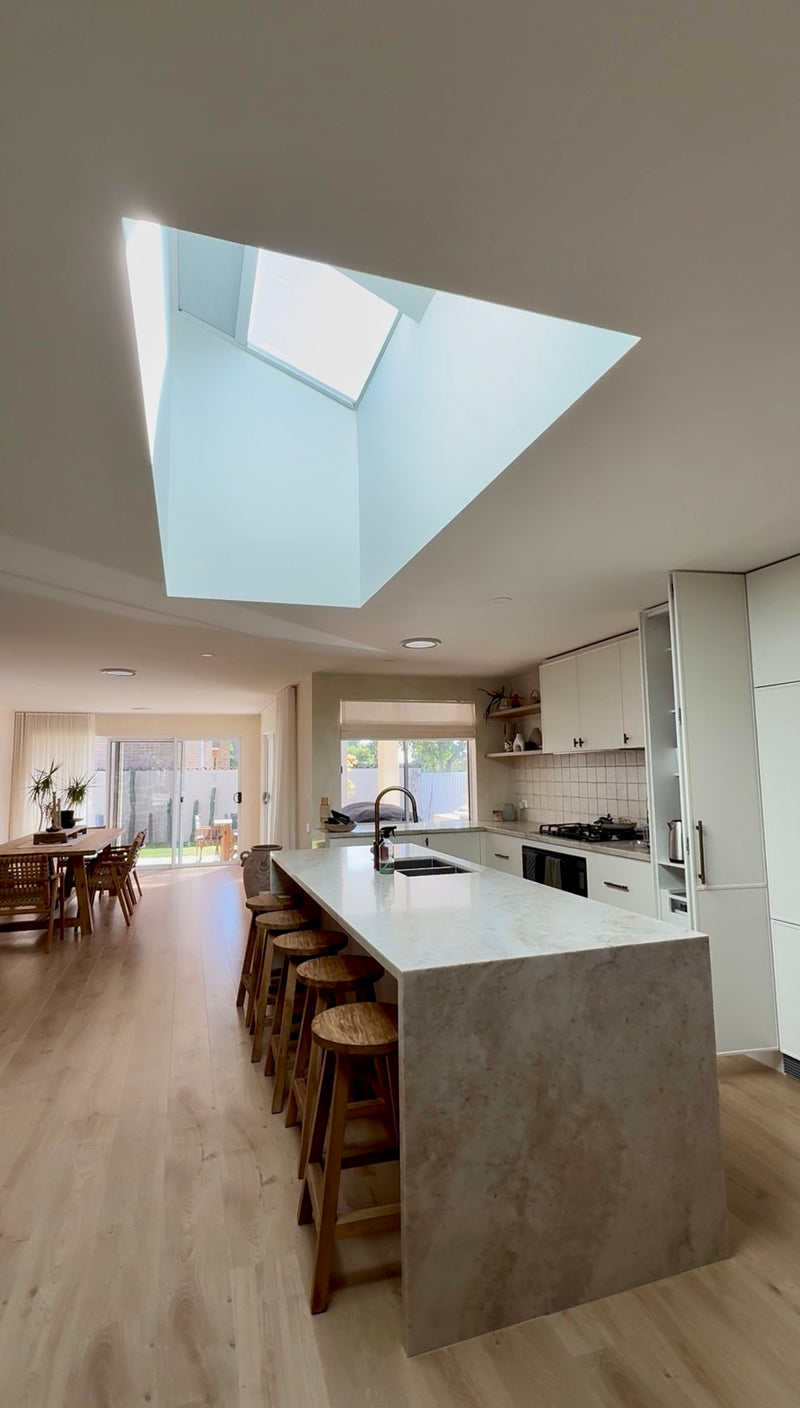 In this project we installed two VELUX skylights above the kitchen island, creating a large light well that floods the entire living area with natural light.